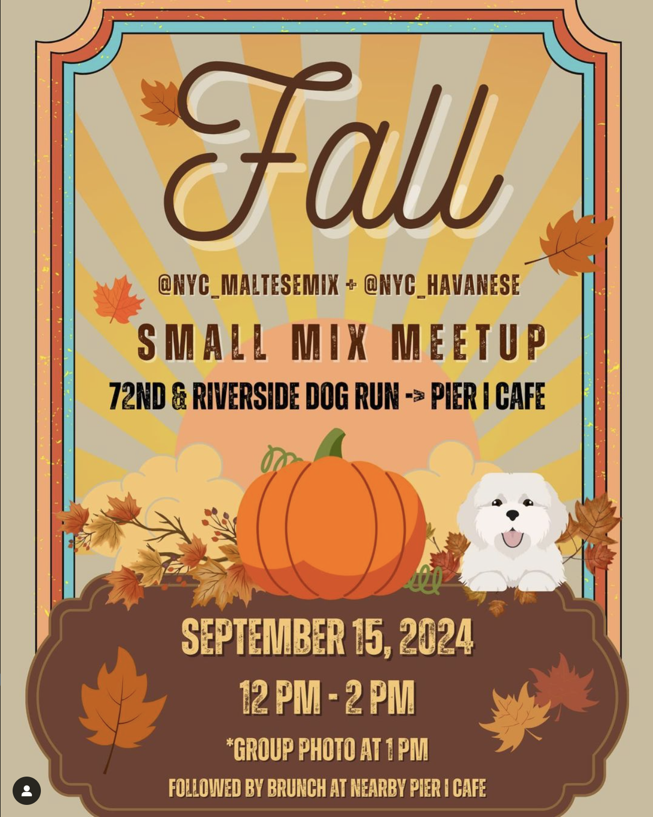📅 Sunday, September 15th 🌳 72nd and Riverside Dog Run ⏱️ 12 pm - 2 pm (group 📸 at 1pm) 🥤🍔🦴Following the group photo we plan to take a short walk to Pier I Cafe for drinks/lunch