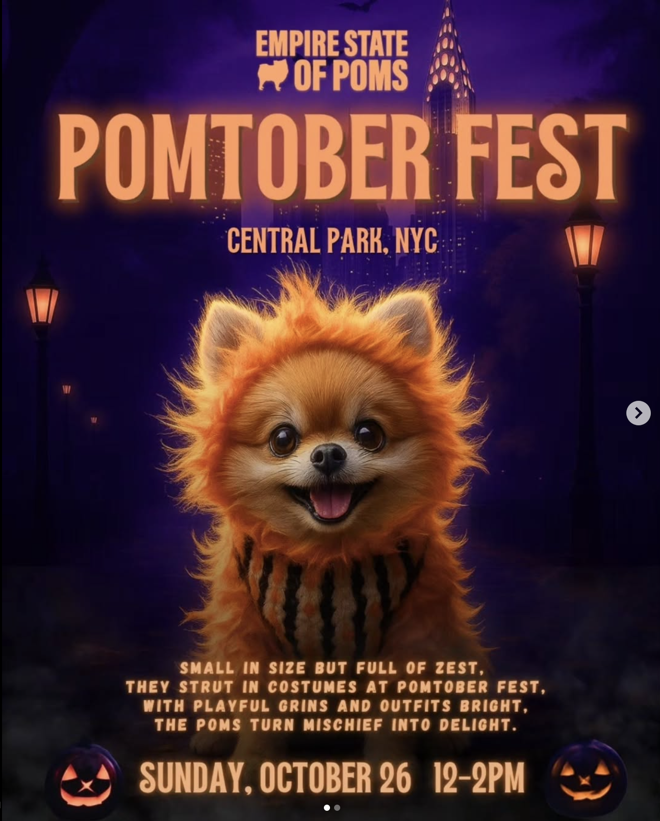 This free event is a gathering for all our Pom friends and Pom enthusiasts. Watch as our Poms strut in costumes, show off their playful personalities, and enjoy a day of fall fun in Central Park. Let them play on the grass, breathe in the crisp autumn air, and revel in the seasonal festivities. π