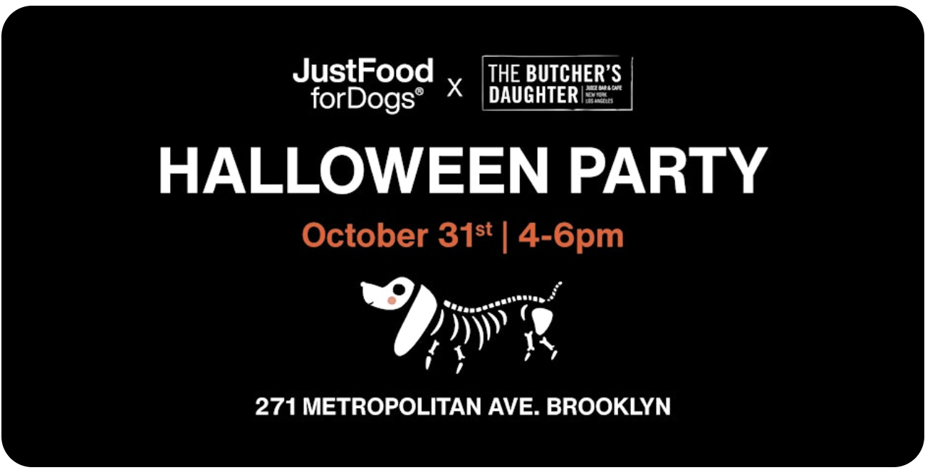 Join JustFoodForDogs and The Butcher's Daughter for a Halloween Party in Brooklyn! Enjoy a festive afternoon with your pup featuring a costume contest, photobooth, and pumpkin pup-cup station, all while celebrating spooky season with great food, prizes, and community vibes.